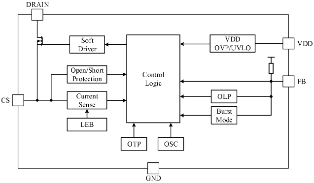內(nèi)置高壓MOSFET:提供高性能、低待機(jī)功耗和低成本的離線反激式轉(zhuǎn)換器應(yīng)用。