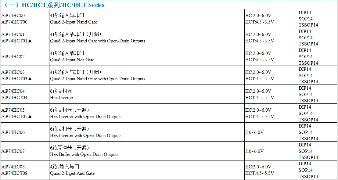 AC(先進CMOS)和ACT(先進CMOS TTL兼容)系列適用于高速應用。國產AiP74AC系列和AiP74ACT系列在高速性能上與進口產品相當。例如,AiP74AC00(4路2輸入與非門)與TI的SN74AC00在工作電壓(1.5~5.5V)、傳播延遲(3ns)和封裝形式(DIP14, SOP14, TSSOP14)上完全兼容。