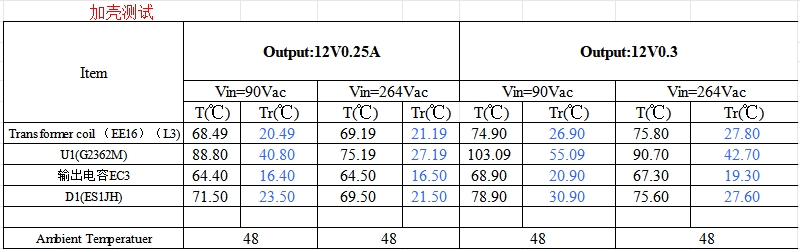 溫升測試結果顯示,兩款芯片在滿載運行時,關鍵部件的溫度上升均在安全范圍內。例如,變壓器線圈(EE16)的溫升在73℃至75.5℃之間,遠低于其最高工作溫度,確保了產品的長期可靠性。