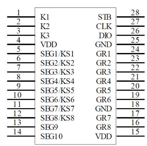 MCU數字接口:包括CLK(時鐘輸入)、DIO(數據輸入/輸出)、STB(片選)等引腳,用于與微控制器進行通信。