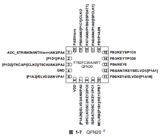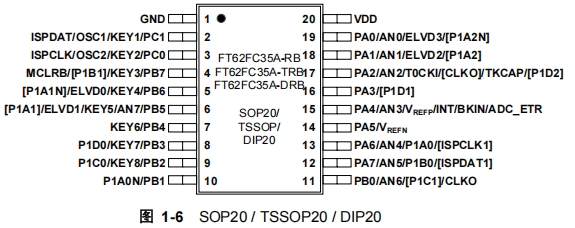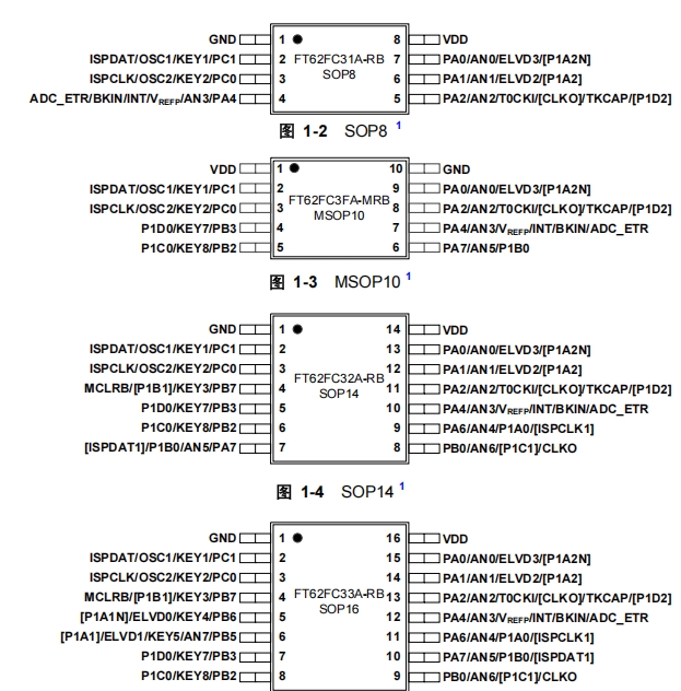 FT62FC6X系列微控制器根據(jù)不同的封裝類型和功能需求,提供了多種引腳配置。以下是結(jié)構(gòu)框圖及一些常見的引腳及其功能介紹: