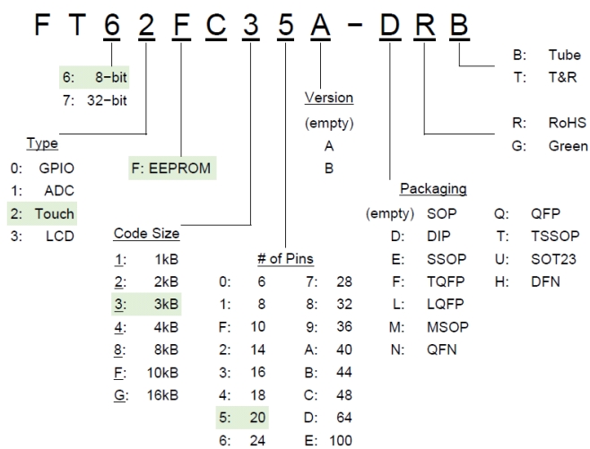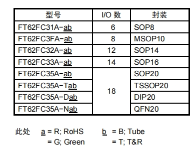 FT62FC6X系列的基礎(chǔ)型號為“FT62FC”,其中: