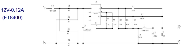 輸入端:與FT8410類似,通過整流橋將交流輸入電壓轉換為直流電壓,經(jīng)過電感和電容進行濾波處理。