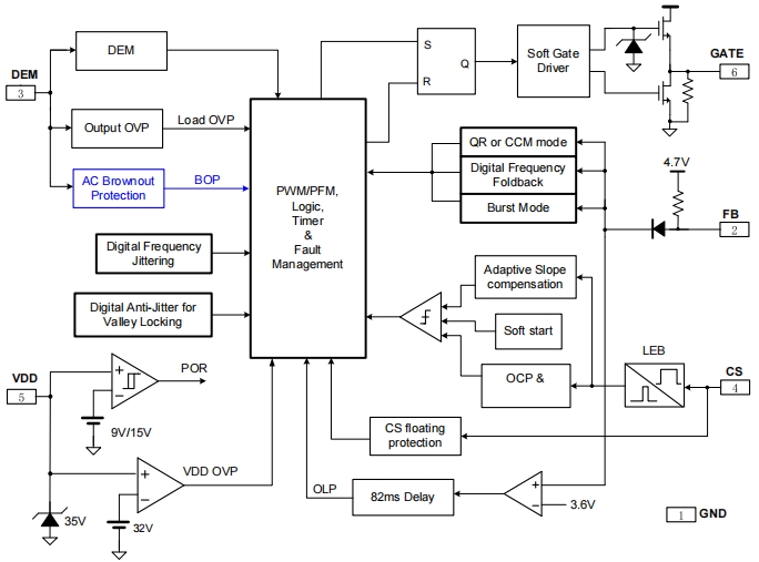 軟啟動功能:內置4ms的軟啟動時間,逐周期增大CS電流限閾值,有效降低了變壓器磁飽和的風險,同時減少了次級二極管在啟動時所受的應力。