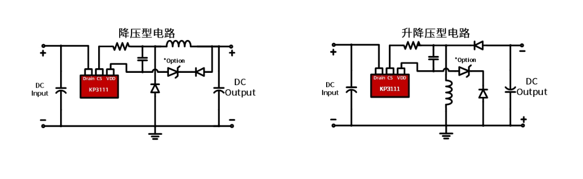 KP3111支持降壓型與升降壓型兩種拓?fù)洌韵聻榈湫徒祲盒蛻?yīng)用電路: