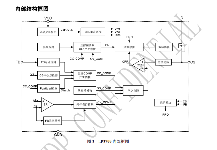 LP3799FBC 內部集成大于 650V 高壓功率管,采用特有的檢測方式和算法,系統可以工作在恒壓和恒流兩種狀態。
