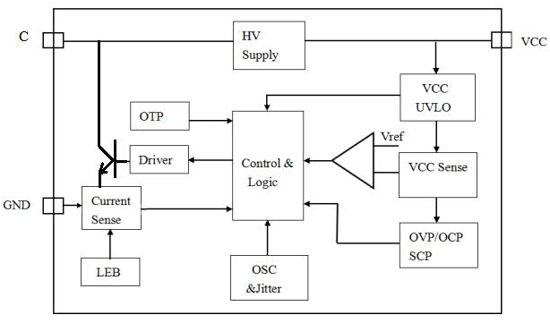 其內部集成了650V功率開關,采用專利電壓電流控制技術,無需外部電壓反饋和電流偵測電路即可實現精確的電壓和電流調節,并可實現兩種輸出電壓選擇,極大的方便客戶使用。